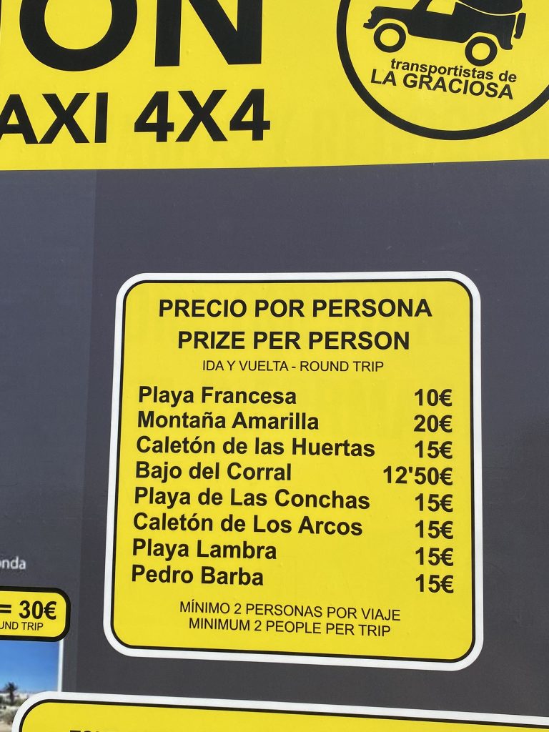 La Graciosa: Para visitar esta preciosa isla tendrás que coger un ferry desde el puerto de Órzola, nosotros reservamos los billetes AQUI. El precio es de 29 euros por persona ida y vuelta y el trayecto dura unos 25 minutos. Ten en cuenta que los ferrys salen muy puntuales y no esperan si llegas tarde. En el mismo puerto tienes un parking gratuito especifico si coges el ferry.